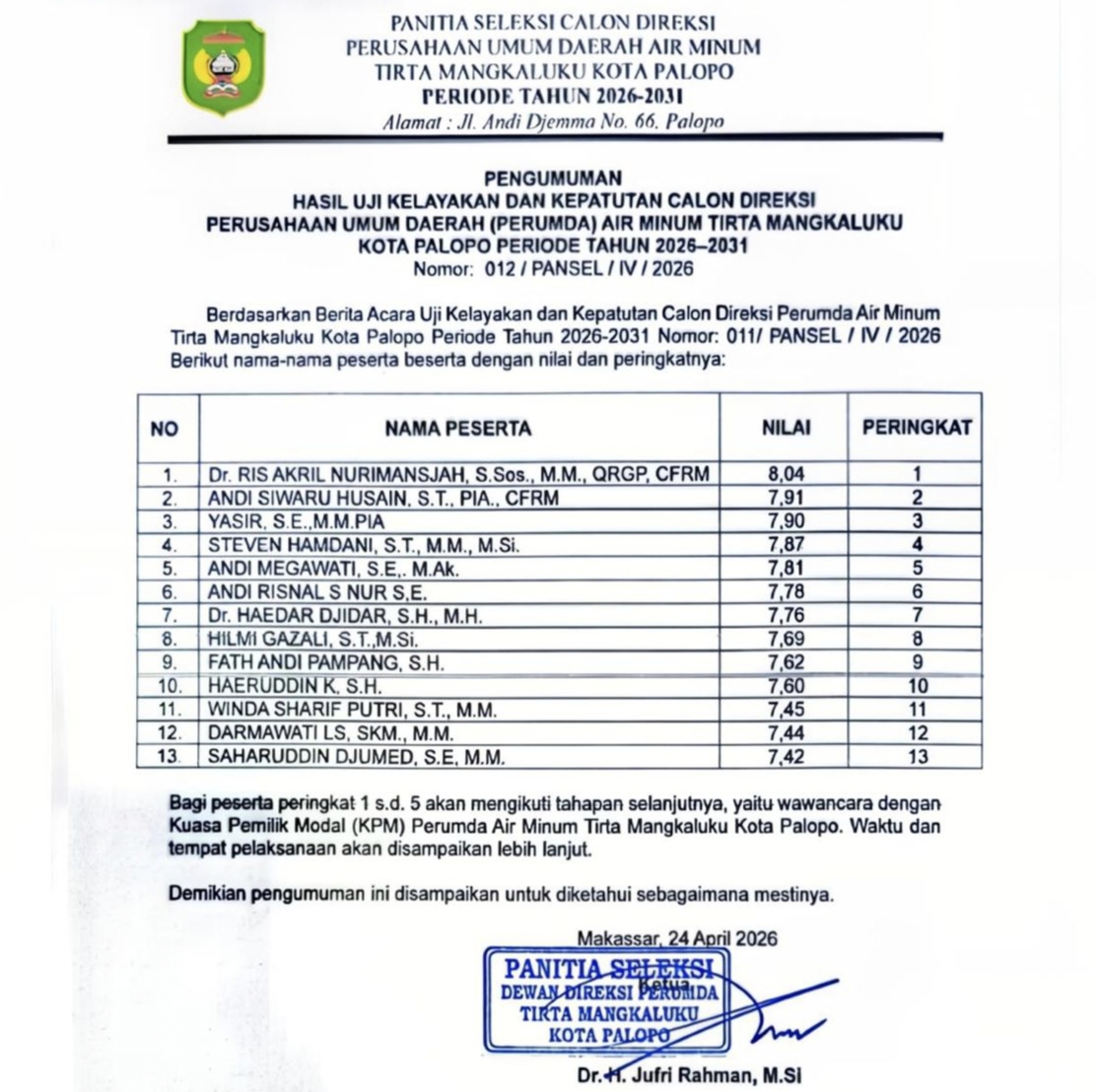 Dalam hasil tersebut, Ris Akril berhasil menempati peringkat pertama dengan perolehan nilai 8,04, mengungguli peserta lainnya dalam tahapan seleksi yang menjadi penentu menuju posisi strategis di tubuh Perumda TM Palopo.
