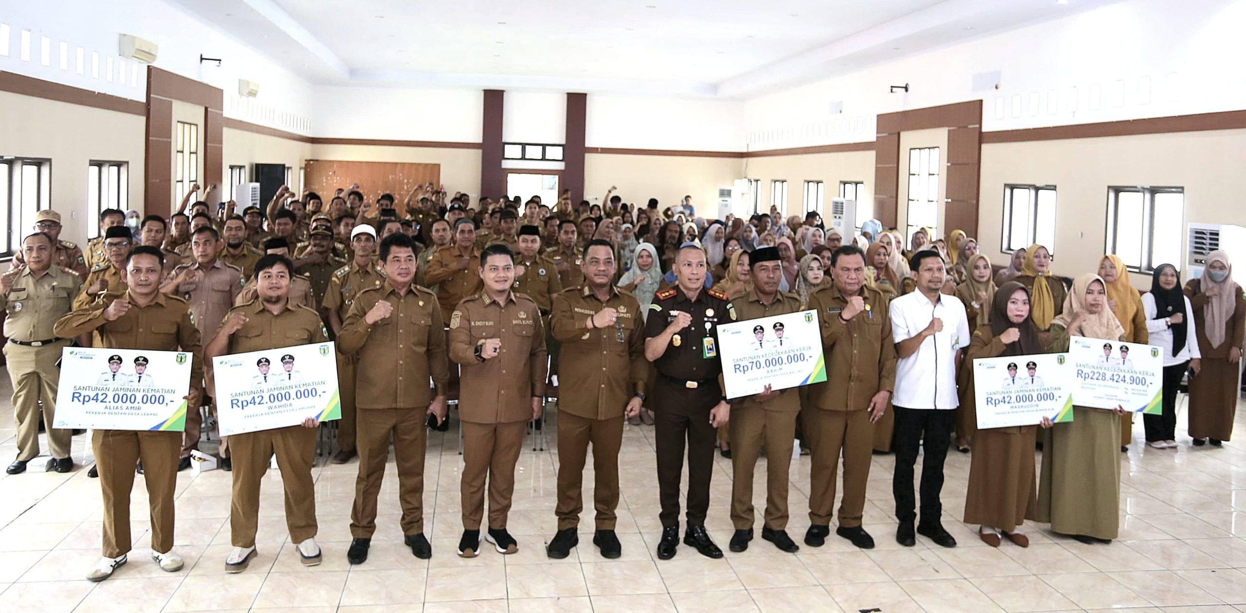 Sebagai penutup acara, Bupati Patahudding menyerahkan langsung santunan kematian dan santunan kecelakaan kerja kepada ahli waris pekerja rentan serta aparat desa yang telah meninggal dunia.