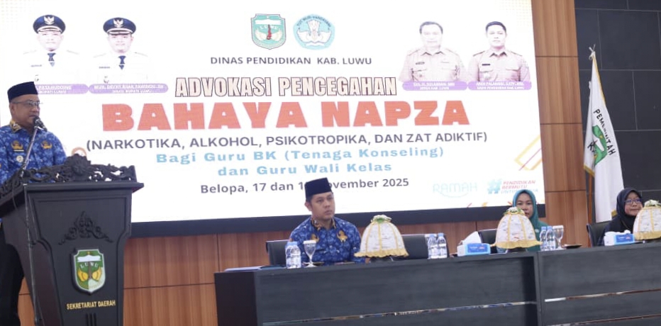 LUWU – Pemerintah Kabupaten Luwu melalui Dinas Pendidikan menyelenggarakan kegiatan advokasi pencegahan bahaya Narkotika, Psikotropika, dan Zat Adiktif lainnya (NAPZA) bagi guru bimbingan dan konseling serta guru wali kelas se-Kabupaten Luwu di Ruang Pola Andi Kambo Kantor Bupati Luwu, Senin (17/11/2025).