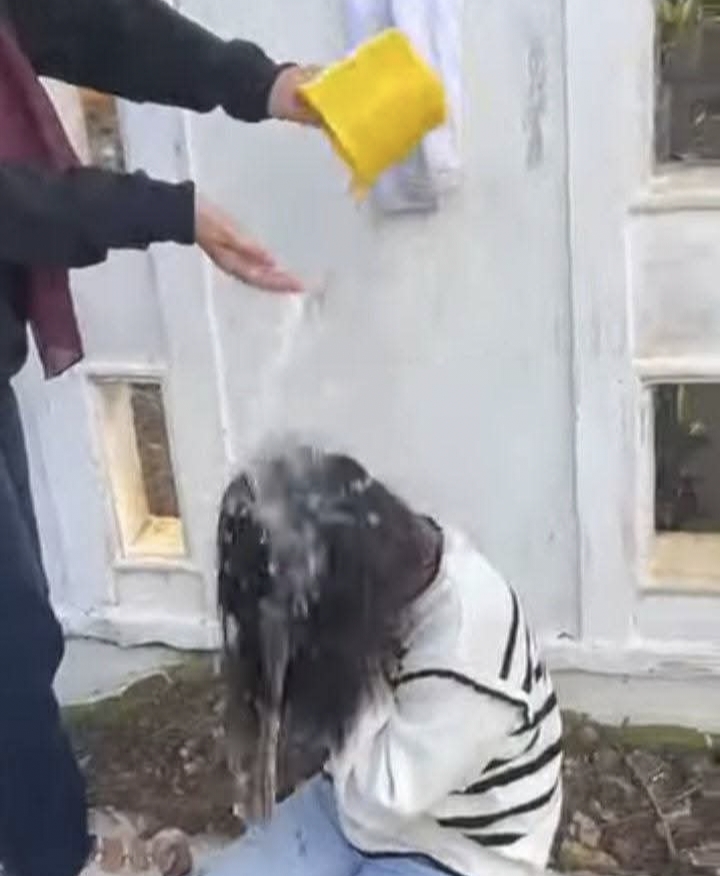 Tidak hanya itu, pelaku juga menyiram kepala korban menggunakan sebuah timba berwarna kuning.