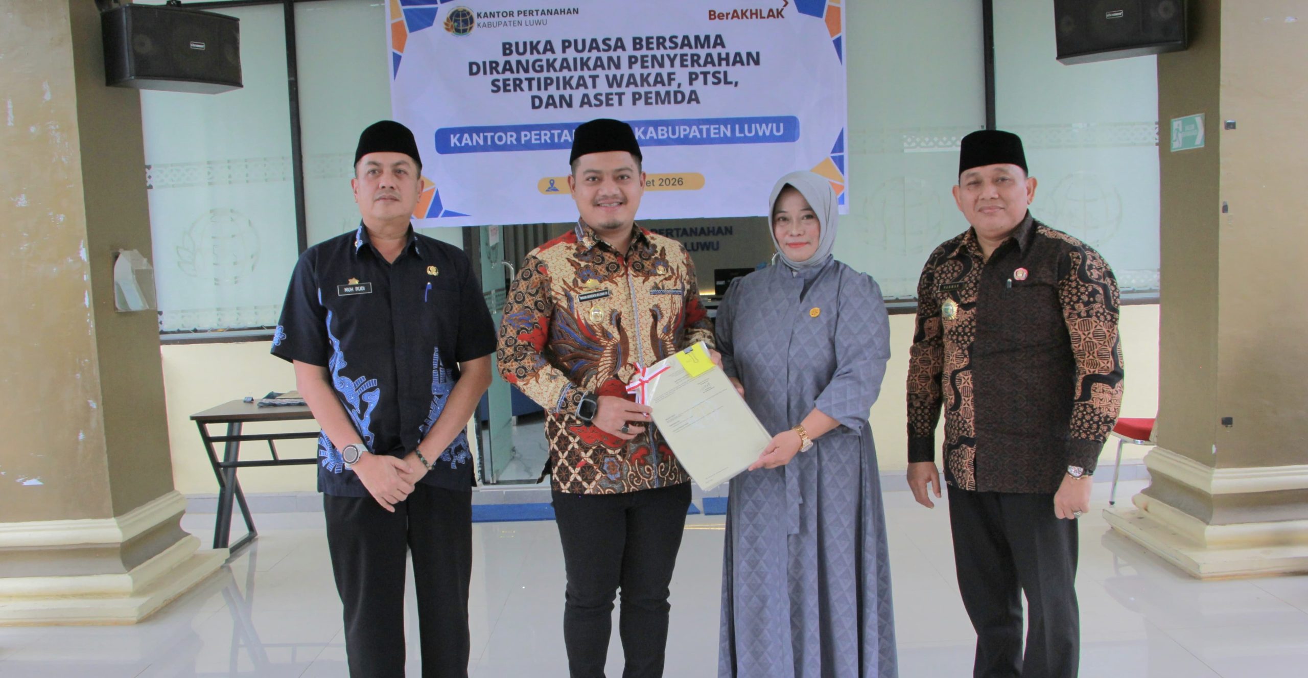 LUWU – Wakil Bupati Luwu menghadiri kegiatan buka puasa bersama yang dirangkaikan dengan penyerahan sertipikat wakaf, Pendaftaran Tanah Sistematis Lengkap (PTSL), serta sertipikat aset Pemerintah Daerah di Kantor Pertanahan Kabupaten Luwu, Kamis (5/3/2026).