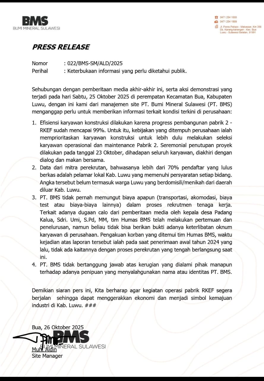 LUWU — Manajemen PT. Bumi Mineral Sulawesi (PT. BMS) akhirnya angkat bicara menanggapi sejumlah kabar yang beredar dan aksi demonstrasi yang terjadi pada Sabtu, 25 Oktober 2025, tepatnya di perempatan Kecamatan Bua, Kabupaten Luwu.