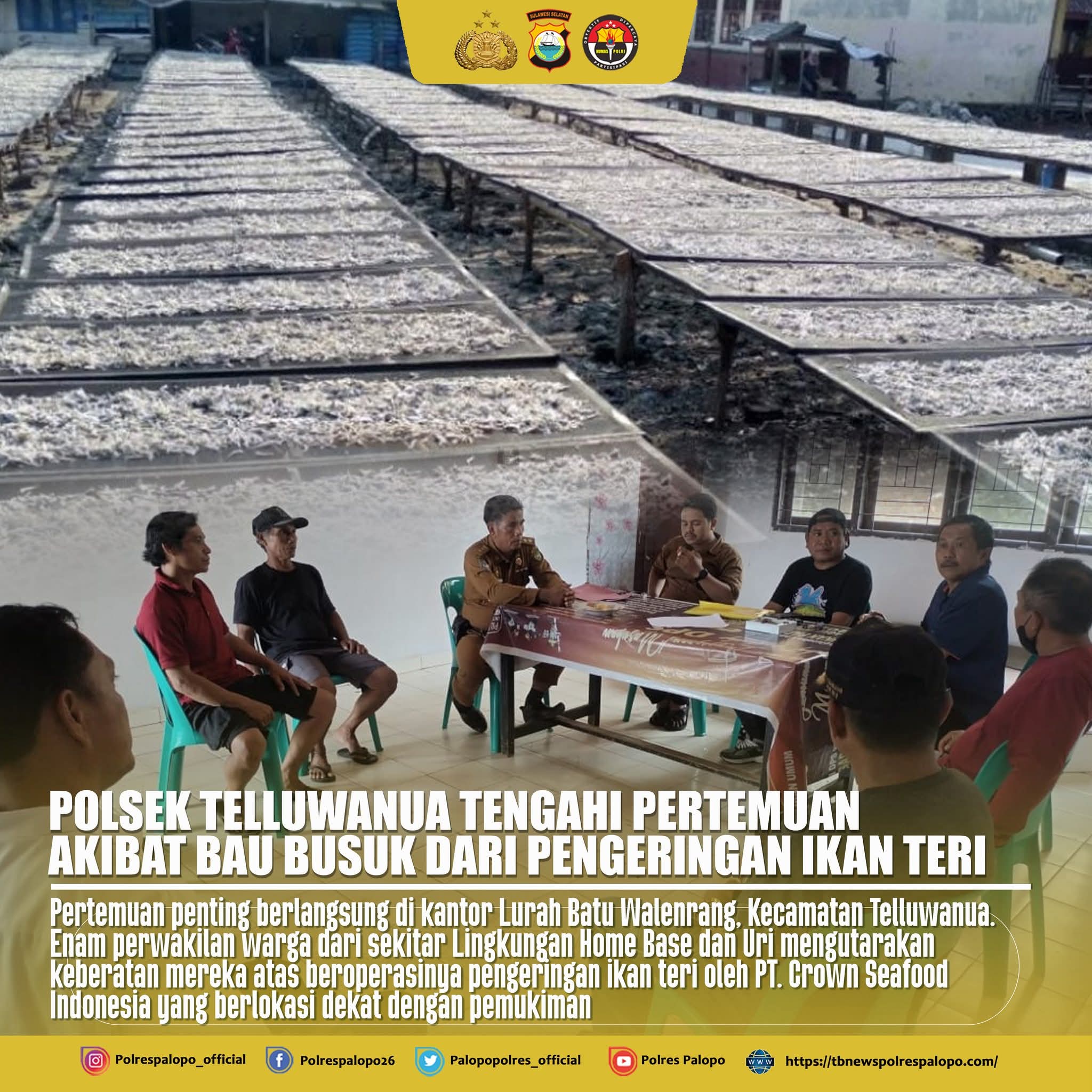 PALOPO – Pertemuan penting berlangsung di Kantor Lurah Batu Walenrang, Kecamatan Telluwanua, Kota Palopo, Senin (29/9/2025). Enam perwakilan warga dari Lingkungan Home Base dan Uri menyampaikan keberatan mereka atas aktivitas pengeringan ikan teri milik PT Crown Seafood Indonesia yang dinilai meresahkan masyarakat karena bau menyengat dan pencemaran lingkungan.